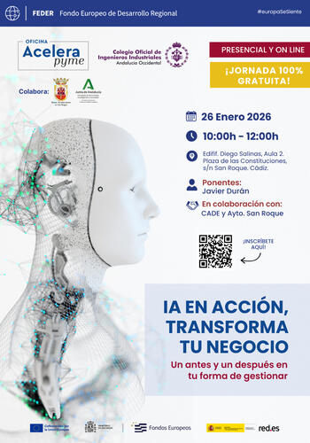 El teniente de alcalde delegado de Empleo, Fernando Vega, ha presentado la jornada informativa denominada “IA en acción, transforma tu negocio. Un antes y un después en tu forma de gestionar”, donde el ponente Javier Durán ofrecerá una charla de dos horas de duración auspiciada por la Oficina “Acelera Pyme”, el Colegio de Ingenieros Industriales, la Junta de Andalucía, y el Ayuntamiento de San Roque, a través de la Delegación de Empleo y Amdel.